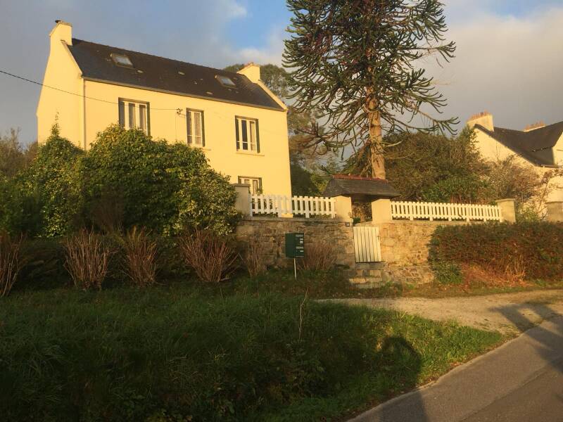 Maison Bretonne traditionnelle avec jardin de 2000m2 engazonné et arboré, parking extérieur et terrasse sud/ouest avec table pour 6 personnes, salon de jardin et barbecue/plancha.